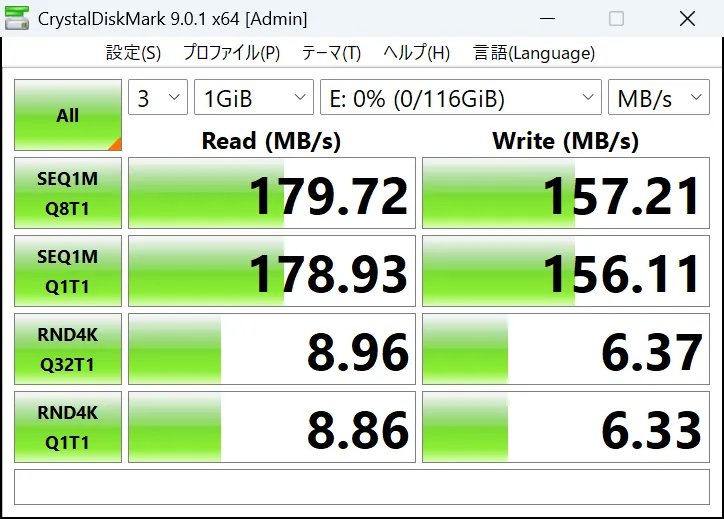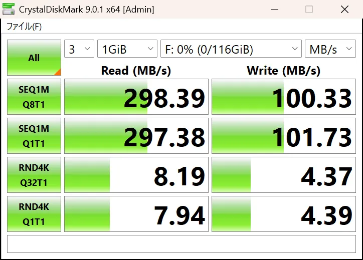 • ただし、後述の持続書込テストでは30MB/s程度に落ちたので、瞬発力特化型っぽいです
